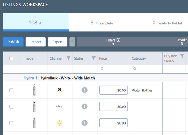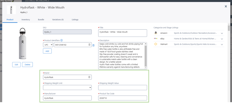 After your products have been imported from your integrated sales channels, we will create a listing for that channel locally in our system. In this example, we have imported our product from Amazon and we want to publish it to eBay and Walmart.