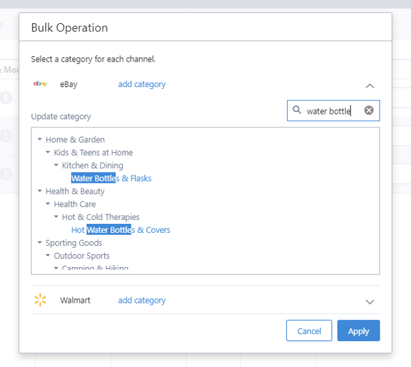 2. Select the items that do not have categories (in this case eBay and Walmart) and click the bulk update option. This will highlight the option to categorize your products.