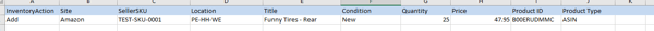 6. Using the export you generated (which includes the items that already exist within your catalog on non-Amazon marketplaces), copy and paste the information into the SellerActive inventory template. The InventoryAction should be set to "Add" as you're adding new products to Amazon.