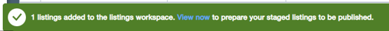 - When the listings are created, you’ll be notified with an alert in the Products Workspace. You can select “View now” to navigate to a filtered view of the listings you’ve just staged. Here you can make sure that the listing has all the information it needs to be published.