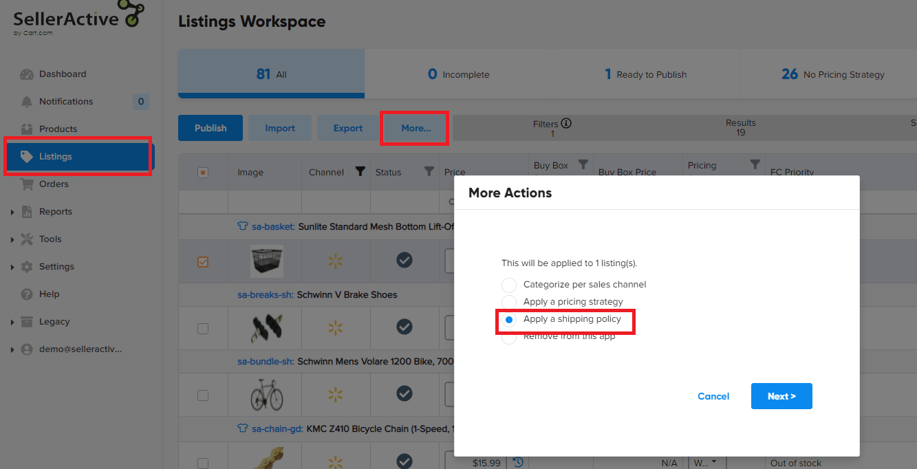 - Upon creating or updating multiple listings from Marketplace Management and publishing out to Walmart, you have the ability to apply the Shipping Template in bulk from the Listings Workspace using the Bulk Operation option (Select listings > Select the Bulk Operation button > Apply a shipping policy > Next > Select the shipping policy and Apply)