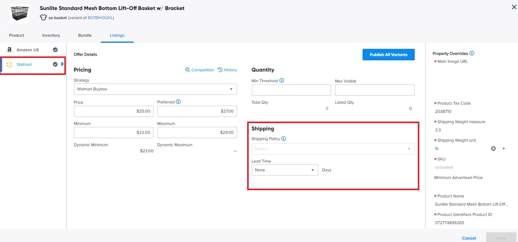 - You may export your Listings from the Listings Workspace to see listing details and/or view it within the listings tab of the SKUPane under Shipping Policy