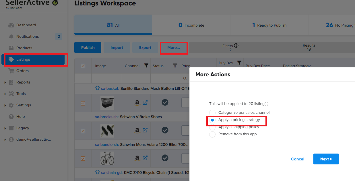 After creating the pricing strategy, you can apply it to your listings in the Listings Workspace one by one, via a bulk action in the Listings workspace, or via a flat file upload.