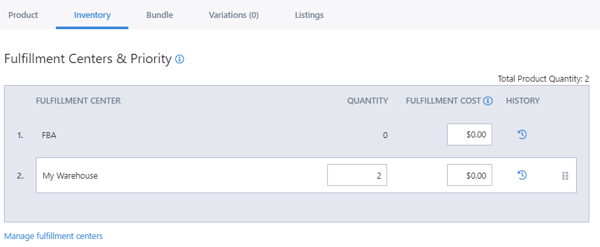 After your Fulfillment Center has been created, you will see it in the list of options within each SKU. If you do not create a Fulfillment Center then every non-FBA item will be assigned to "My Warehouse" by default.