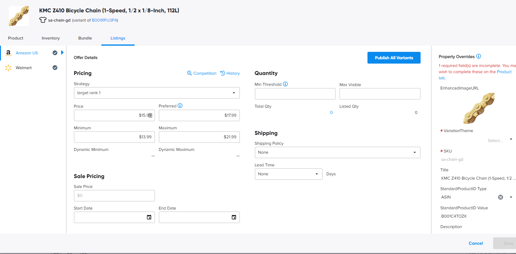 In the final tab, you'll be able to fill out information specific to listing the item on Amazon and Walmart. Here you can add a pricing strategy, and fill in minimum, maximum and sale pricing.