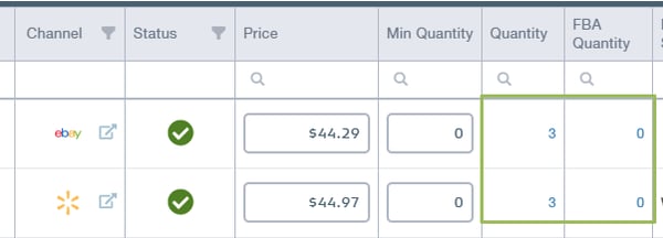 You can view prices and quantities for your items within Marketplace Management's two main workspaces for Listings and Products. All SKU's within Marketplace Management will have at least one Fulfillment Center. You will see your available quantity within the Listings Workspace.