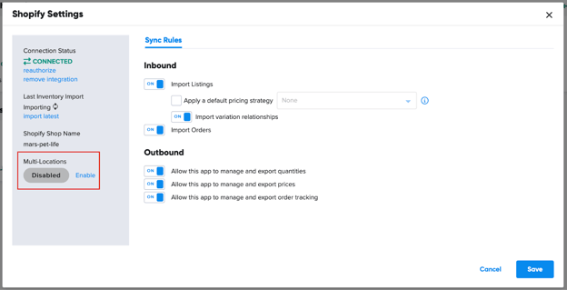3. Once the Enable button is clicked, we will pause importing Shopify orders so that they can follow the new order assignment defined in Shopify. If you receive any Shopify orders during the setup, they’ll import into Marketplace Management with a location assigned by Shopify (once the setup is complete).