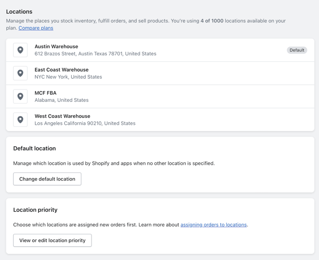 3. Create a new Location in Shopify to represent the new warehouse. Create or update any shipping profiles to include the new warehouse.