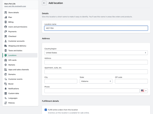 • When you create new locations in Shopify, don’t worry about connecting any apps for 3rd party fulfillment services like FBA. We will still send your order information to the 3rd party. You will just rank the fulfillment priority order within Shopify.