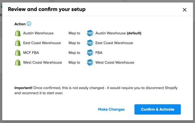 11. Click Confirm & Activate when you’re ready to sync quantities between Shopify Locations and Marketplace Management Fulfillment Centers. Be sure the mapping is to your preferences. You will not be able to make changes unless you remove your Shopify integration and reauthorize it.