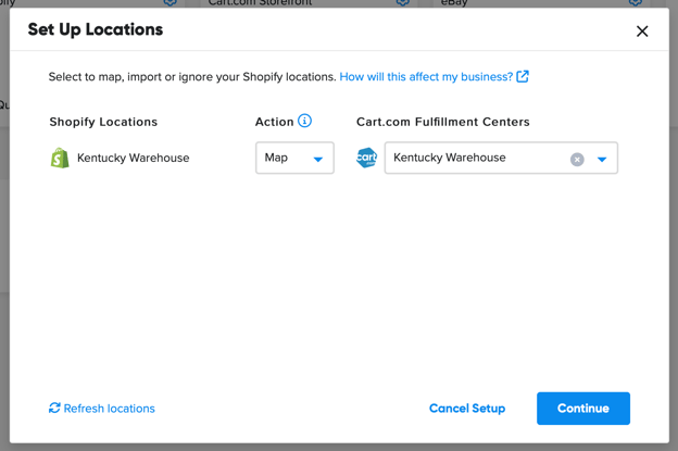7. All of your Shopify locations will appear for mapping. If you don’t see a location, hit the Refresh Locations button.