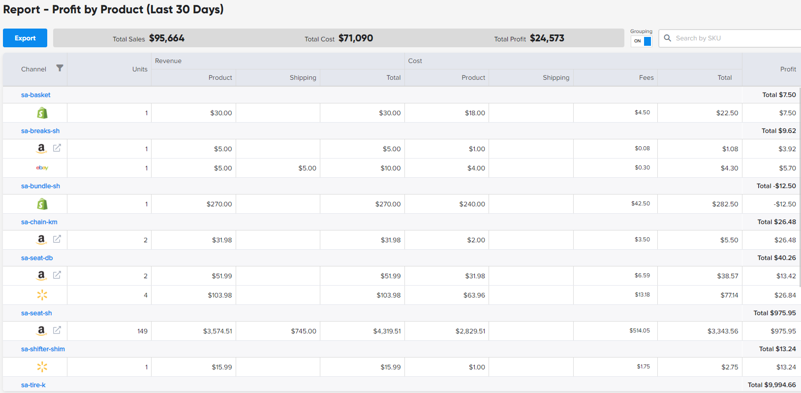 • Profit by Product (New): This report shows how each product has performed over the last thirty days.  You can group products to quickly see how a product performs across all selling channels. Data for the last 30 days can be exported and the ability to export expanded date ranges to meet customer needs is coming.