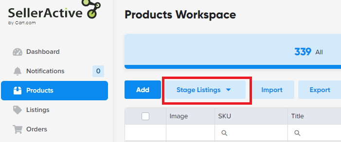 When working with your catalog within Marketplace Management you might notice a button called "Stage Listings" within your Products workspace. This is a key part of the publishing process and if you do not have a listing in Marketplace Management for the Sales channel, we cannot publish your item successfully.